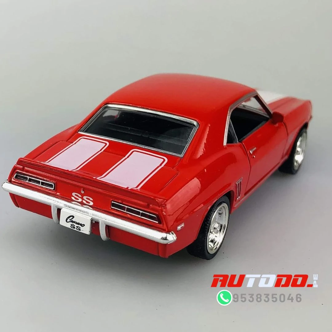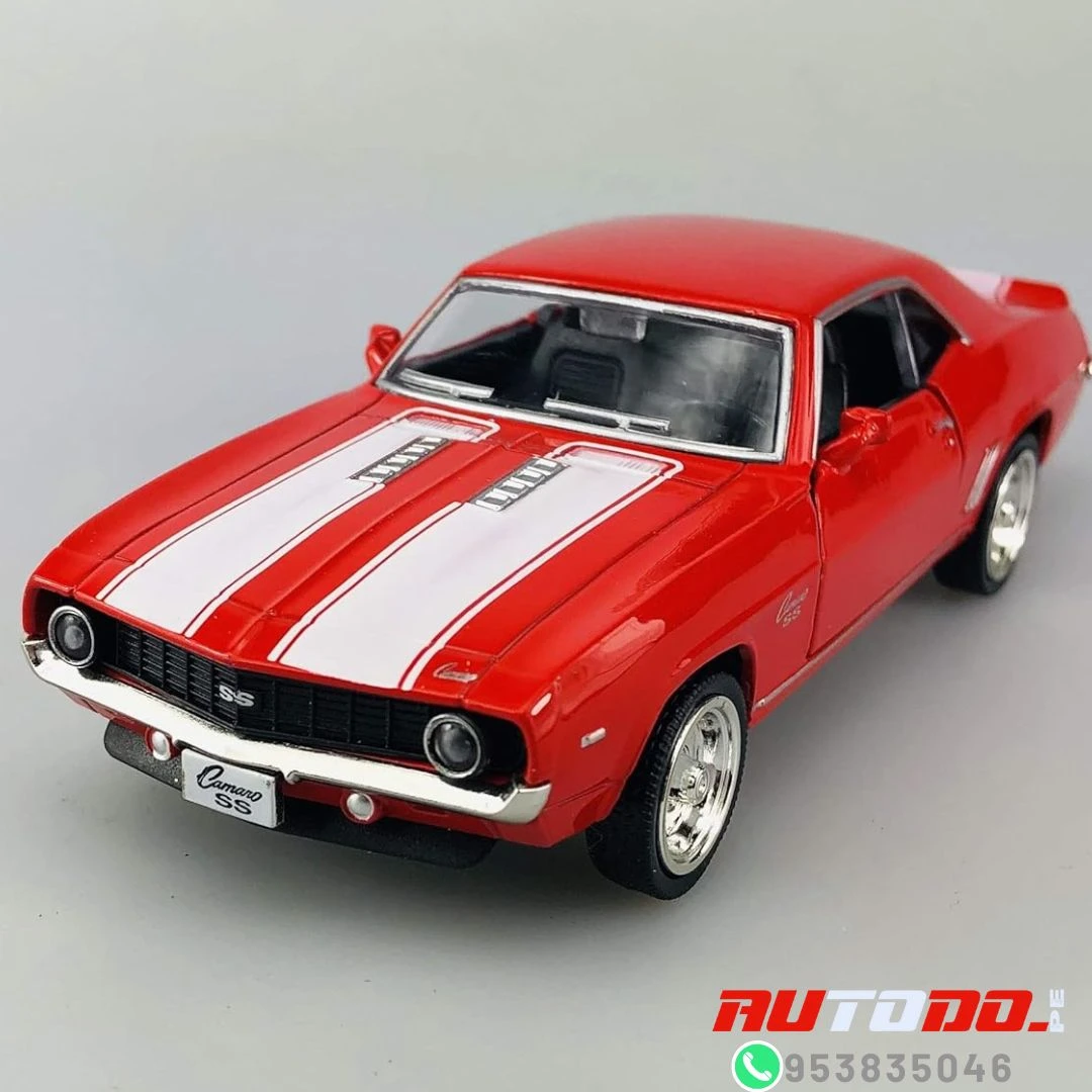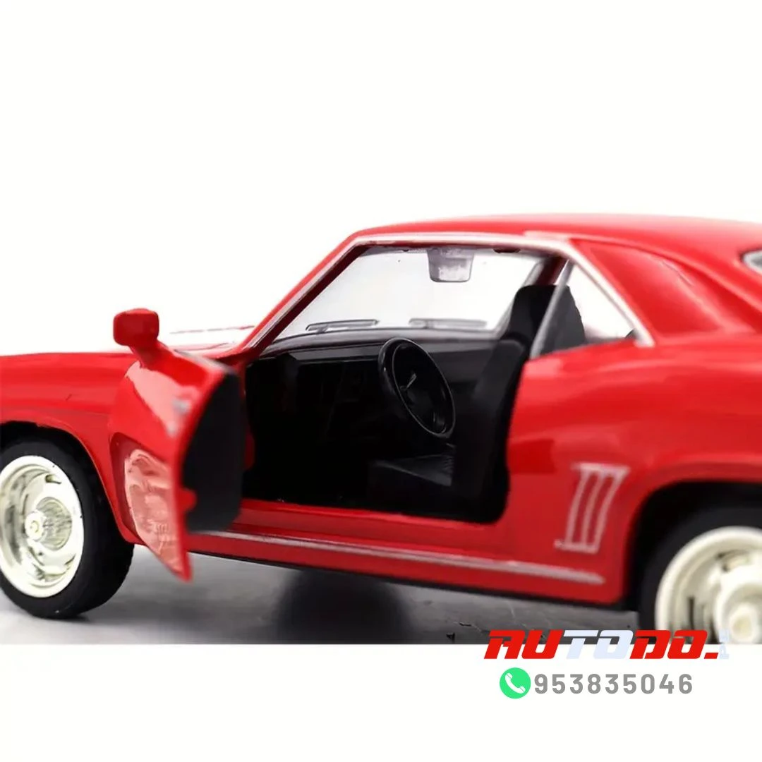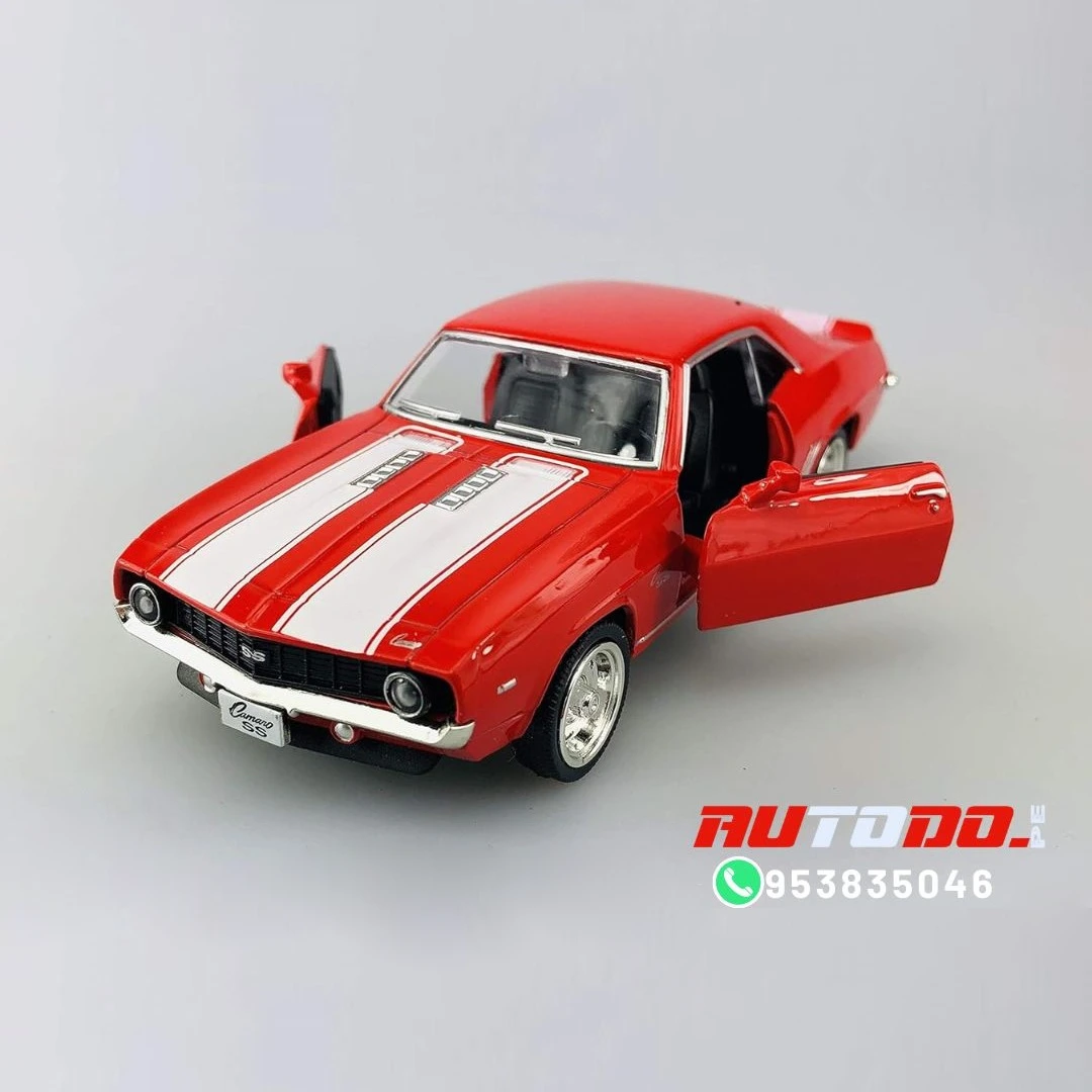 Réplica a escala del coche muscular clásico Chevrolet Camaro de 1969 SS «technodrive» un automóvil de juguete a escala 1:32, con un cuerpo de metal resistente y puertas delanteras que se abren.
