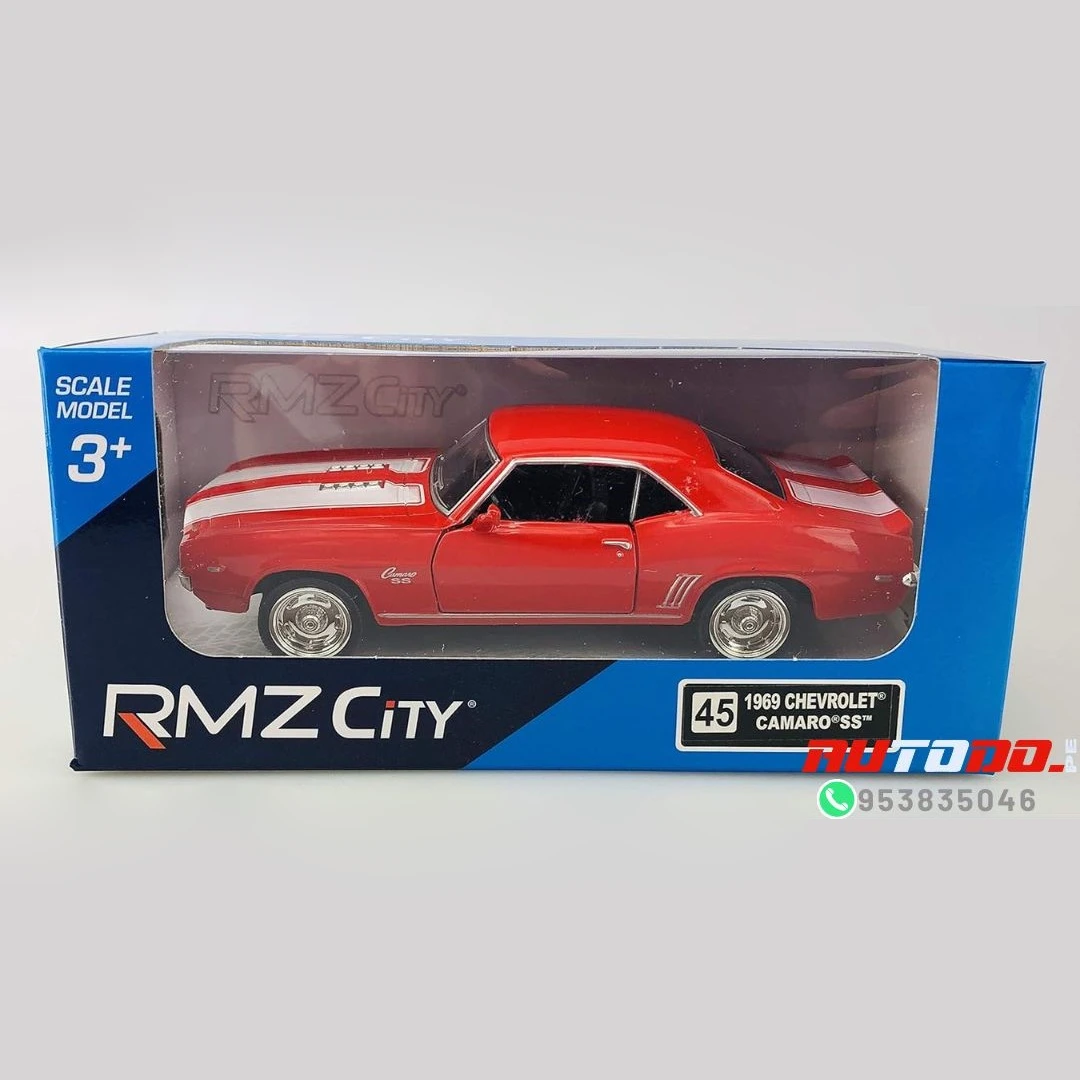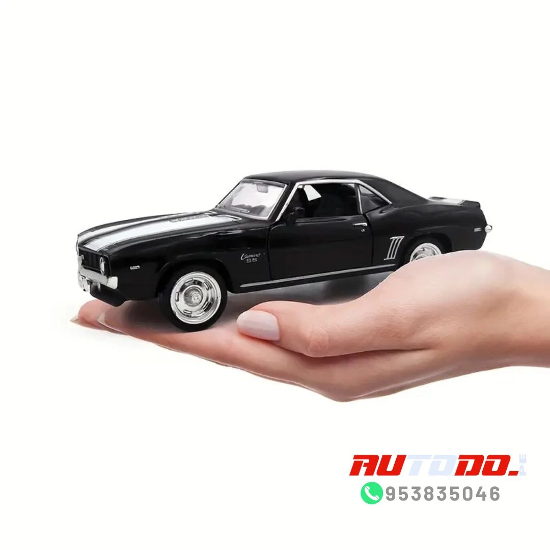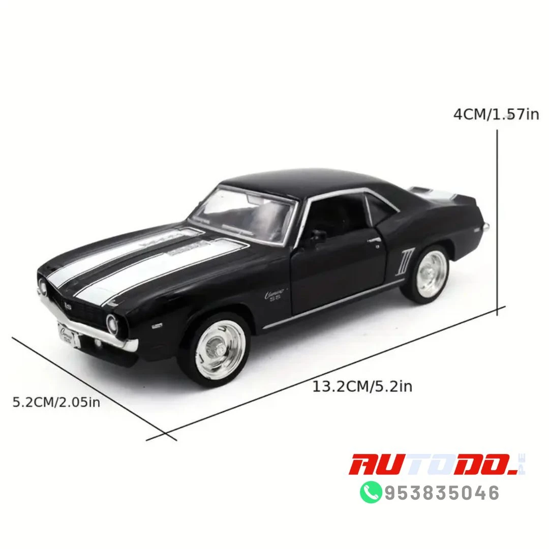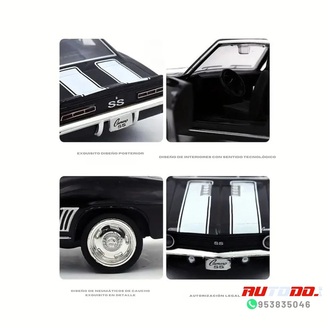 Réplica a escala del coche muscular clásico Chevrolet Camaro de 1969 SS «technodrive» un automóvil de juguete a escala 1:32, con un cuerpo de metal resistente y puertas delanteras que se abren.